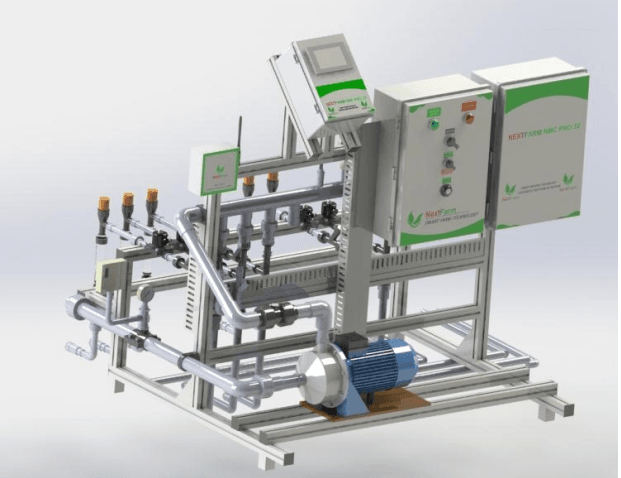 Bộ điều khiển NextX Farm NMC Pro, màn hình màu 7inch, các thiết bị hút phân, khung máy, cảm biến lưu lượng phân, cảm biến lưu lượng nước, bơm phân, hệ thống bảo vệ đường ống, phần mềm và app điều khiển đi kèm.
